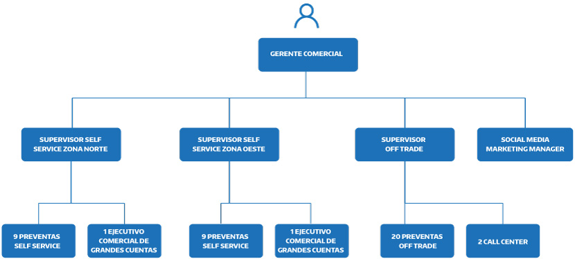Contamos con 1 Jefe de Ventas a cargo de 2 Supervisores Off-Trade y 1 Supervisor Self-Service.